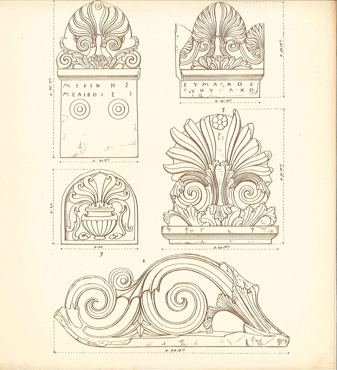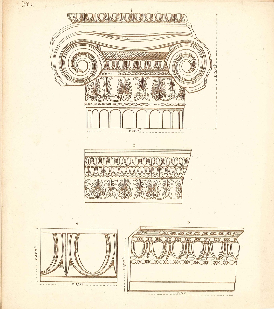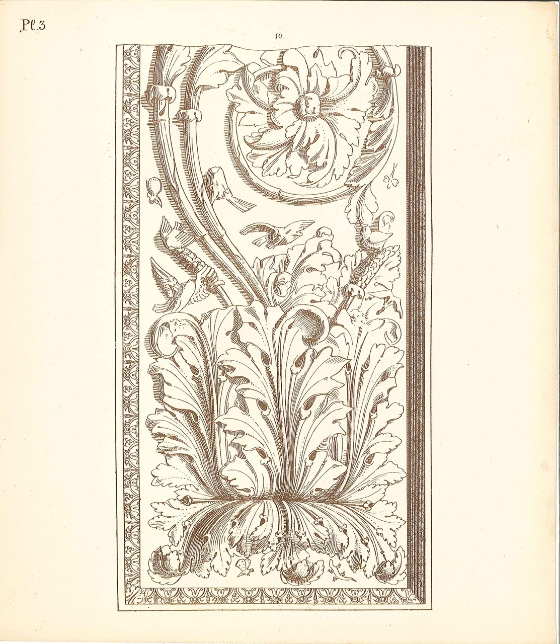 Getekend zijn ornamenten als: voluten, rozetten, kapitelen, sluitstenen, panelen (hou) en sloten.