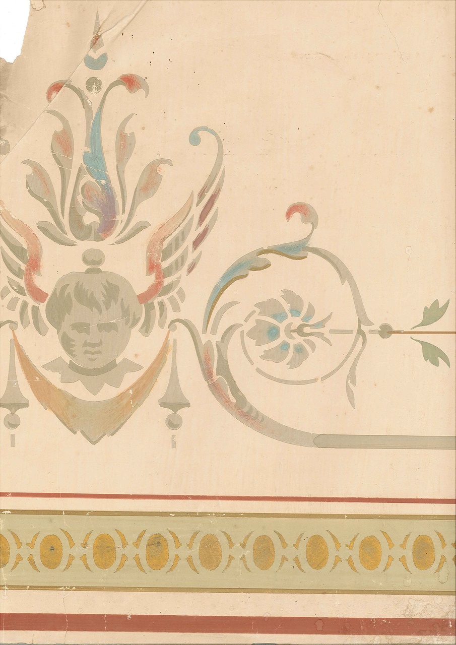 Op de ontwerptekening staan enkele banen met florale en cirkelvormige motieven. Verder is een kinderhoofdje zichtbaar.