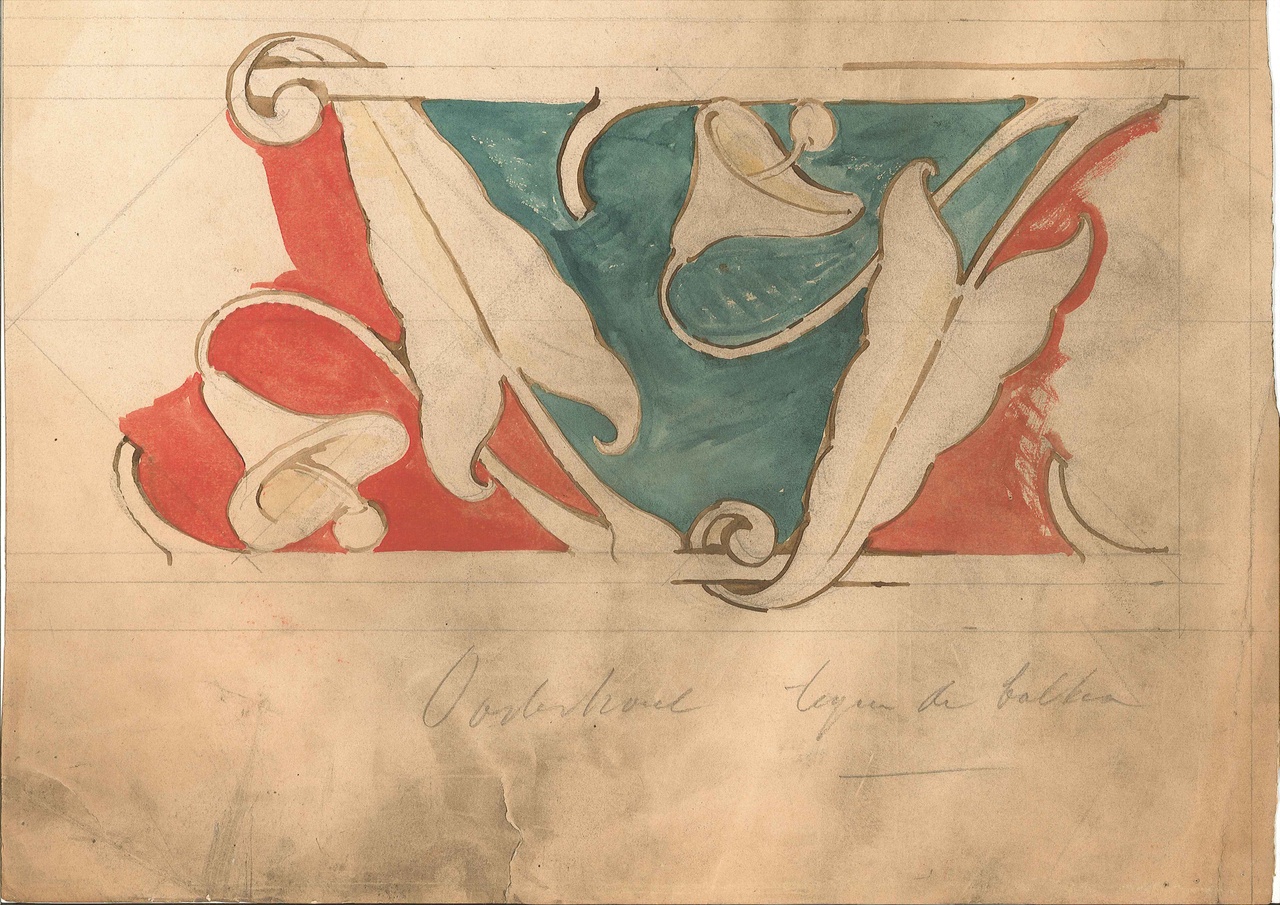 Op de ontwerptekening staan twee banden afgebeeld met florale motieven. Onder de afbeelding is met potlood geschreven: "Oosterhout tegen de balken".