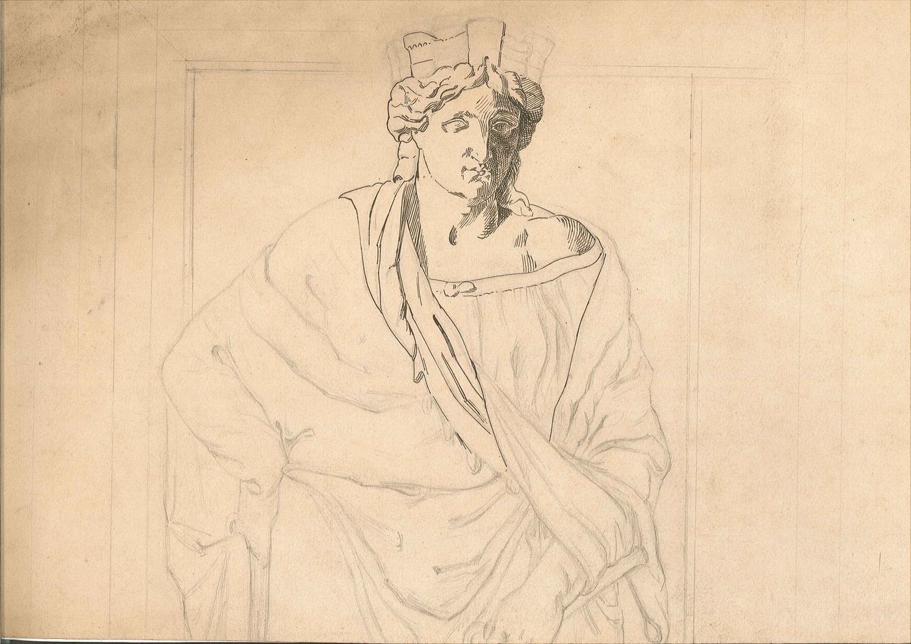 Op de achterzijde staat een potloodtekeningvan een gekroonde vrouw (vorstin?).