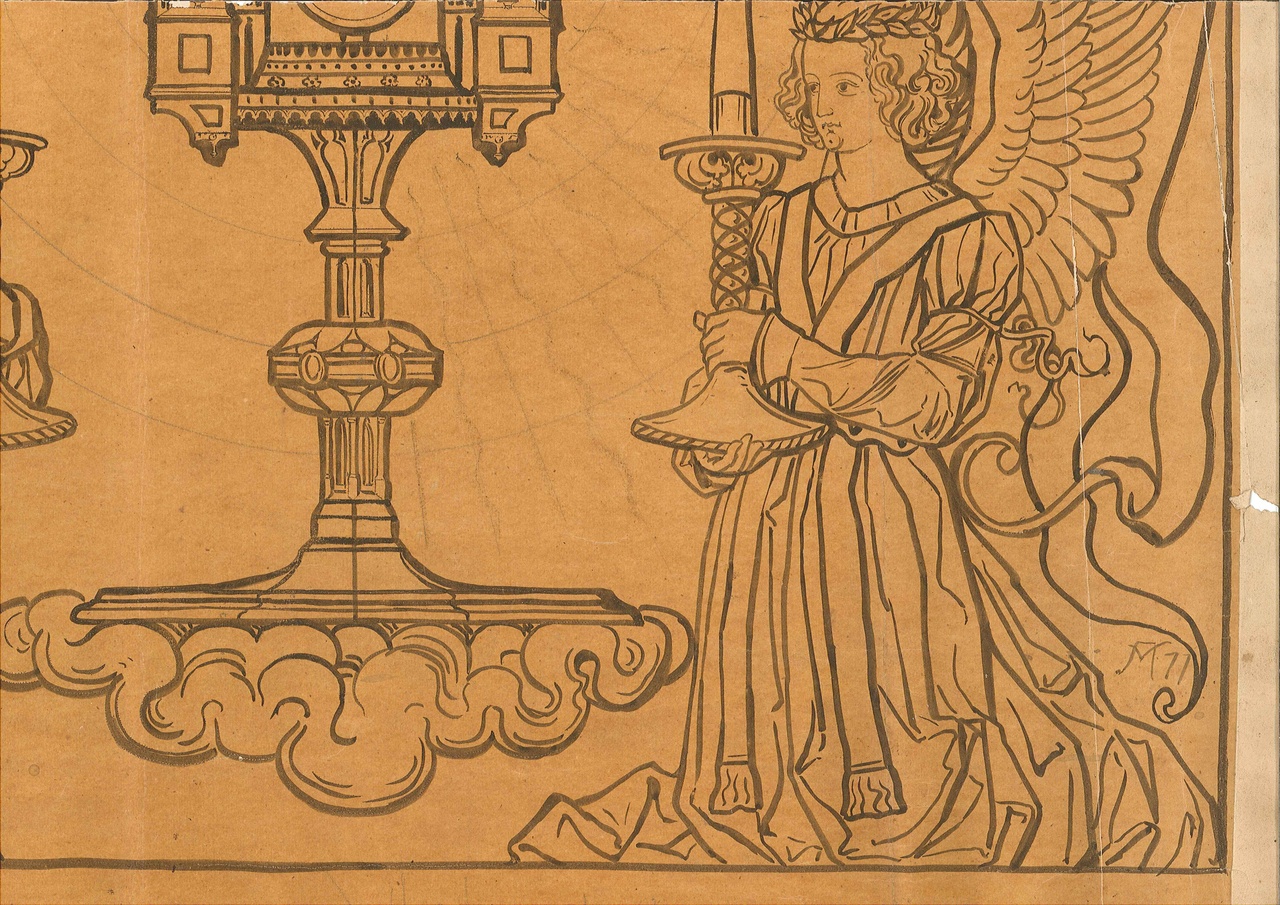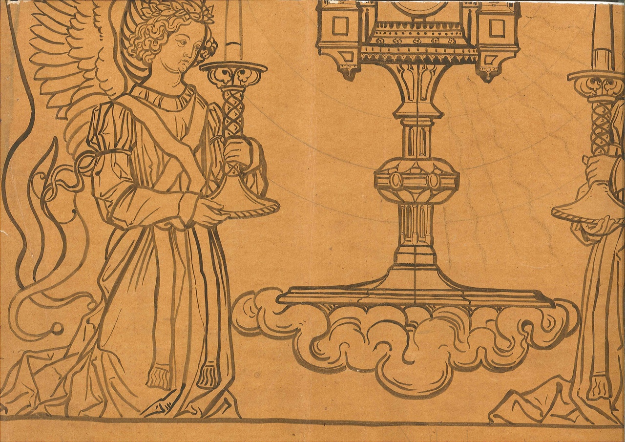 Op het ontwerp staat een tekening van een monstrans geflankeerd door twee engelen met een brandende kaars in de handen.
