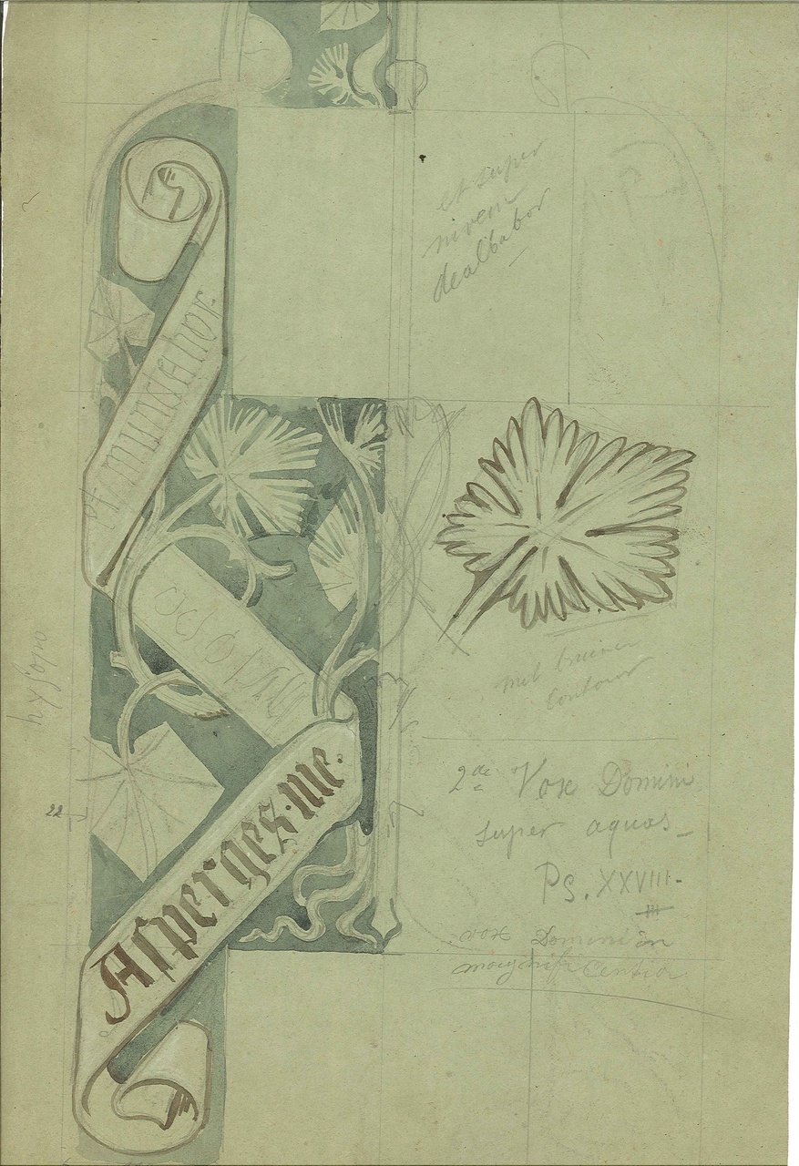 Op de ontwerptekening is een (gedeelte van) een kruis afgebeeld met daar om heen florale motieven (ranken). In de ranken een banier met de onvoltooide tekst: Asperges me ?????? et Munda ???