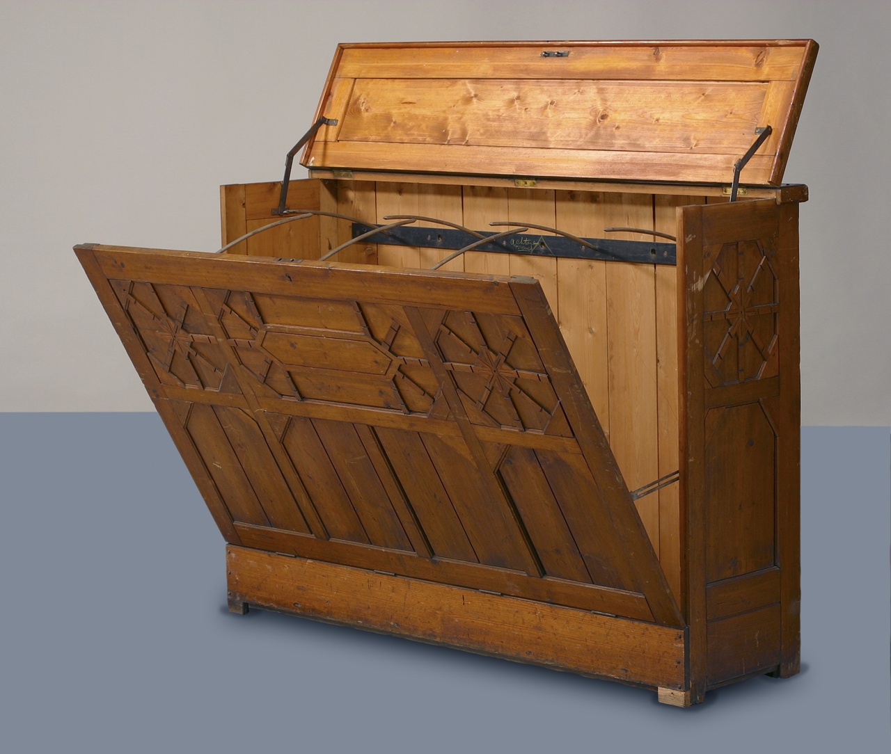 Hangkast met bewerkt front. De bovenkant en de voorkant kunnen geopend worden, zodat men bij de hangende tekeningen kan komen.. Zie foto BR 0619-2